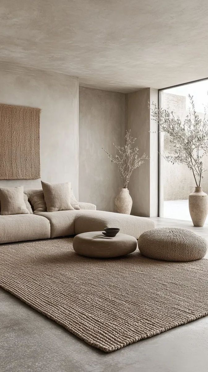 🎨 Paleta ideal: Beige, hueso, gris claro, mezclando texturas (terciopelo, lino, tejido grueso).