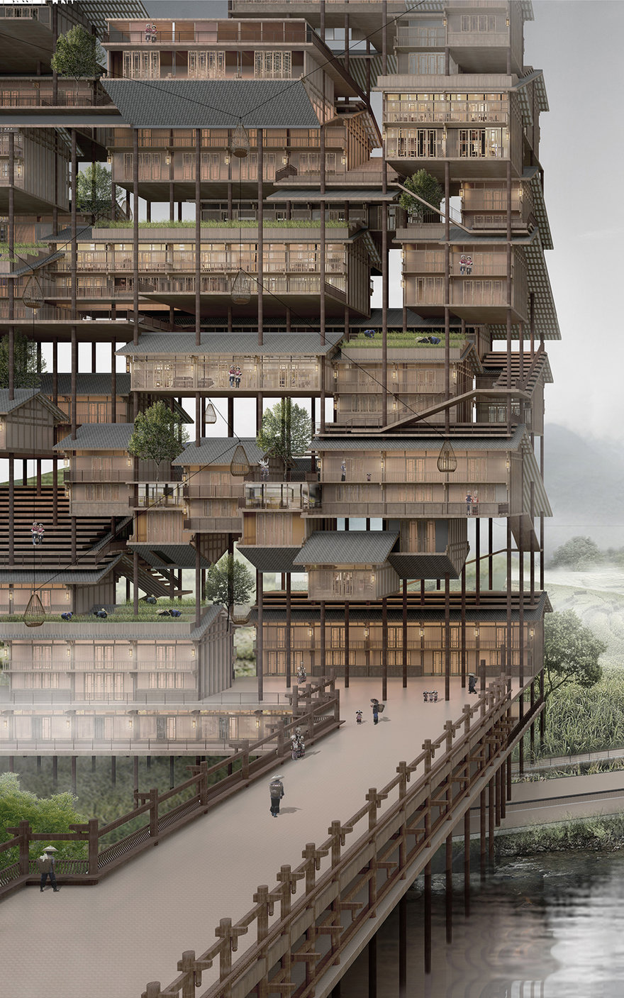 En este proyecto, ganador del tercer lugar del concurso de rascacielos 2021 de la revista de arquitectura eVolo, el techo se usa como área de tráfico y plataforma para conectar las casas unas con otras.
