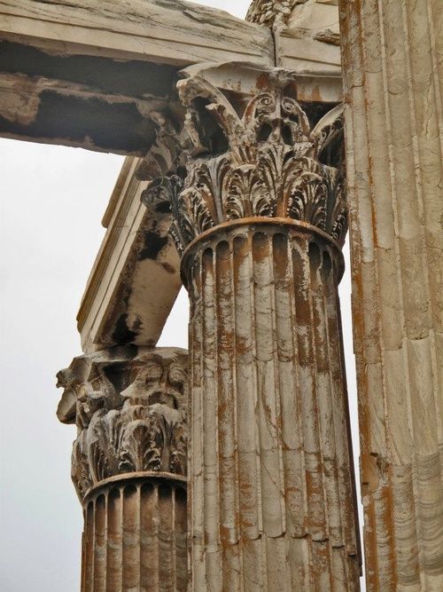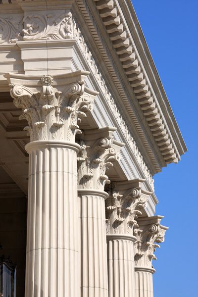 A los griegos les encantaba la piedra caliza y el mármol. Sus diseños destacaban por el uso de columnas (pilares) y capiteles (los remates de las columnas) que seguían unas proporciones estrictas y donde se combinaban los diferentes estilos decorativos: dórico, jónico y corintio. Estos tres órdenes, que van desde lo más sencillo a trabajos más elaborados como las hojas de acanto, son la clave para distinguir la arquitectura griega de la romana.