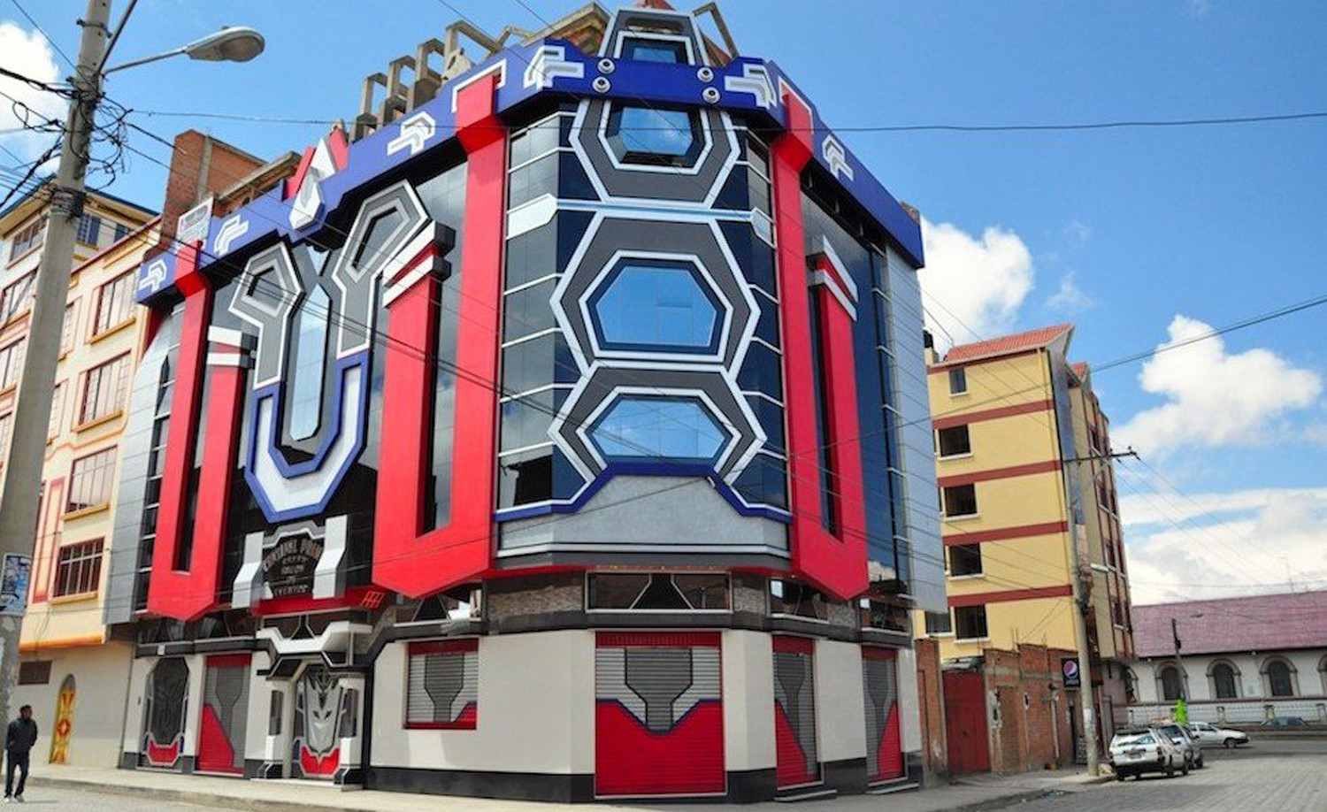 El resultado en el exterior, es un edificio recubierto de espejos, decorado con simbología andina,la cruz cuadrada, la serpiente, el círculo- y pintado con los colores de los aguayos.