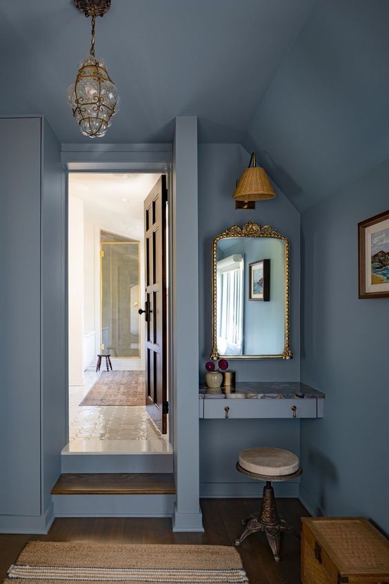 Prueba con Espacios Pequeños Primero: Si no estás seguro de cómo funcionará el color drenching en una habitación grande, prueba primero en un baño o en un pequeño estudio para experimentar con la técnica antes de aplicarla a gran escala.