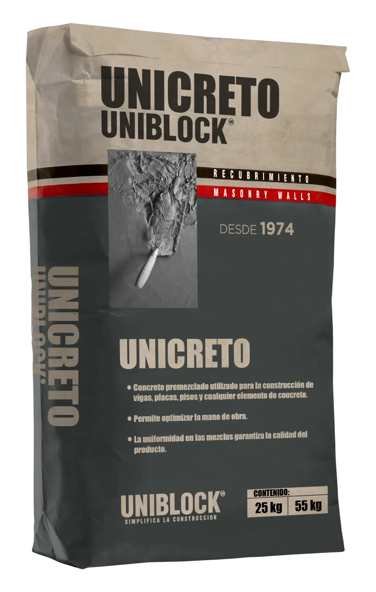 - Resistencia óptima: Con una capacidad de 125 kg/cm², Unicreto es ideal para firmes y otros elementos estructurales de concreto.