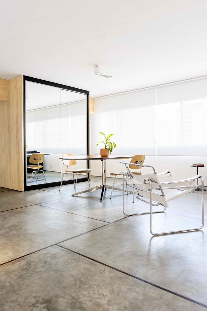 En espacios minimalistas, el concreto pulido aporta una base neutra y elegante que resalta la simplicidad del diseño. Funciona bien con paredes blancas, grandes ventanales y mobiliario de líneas limpias.