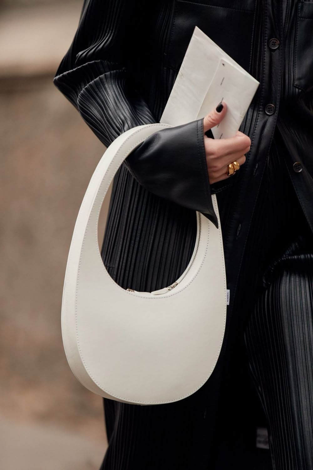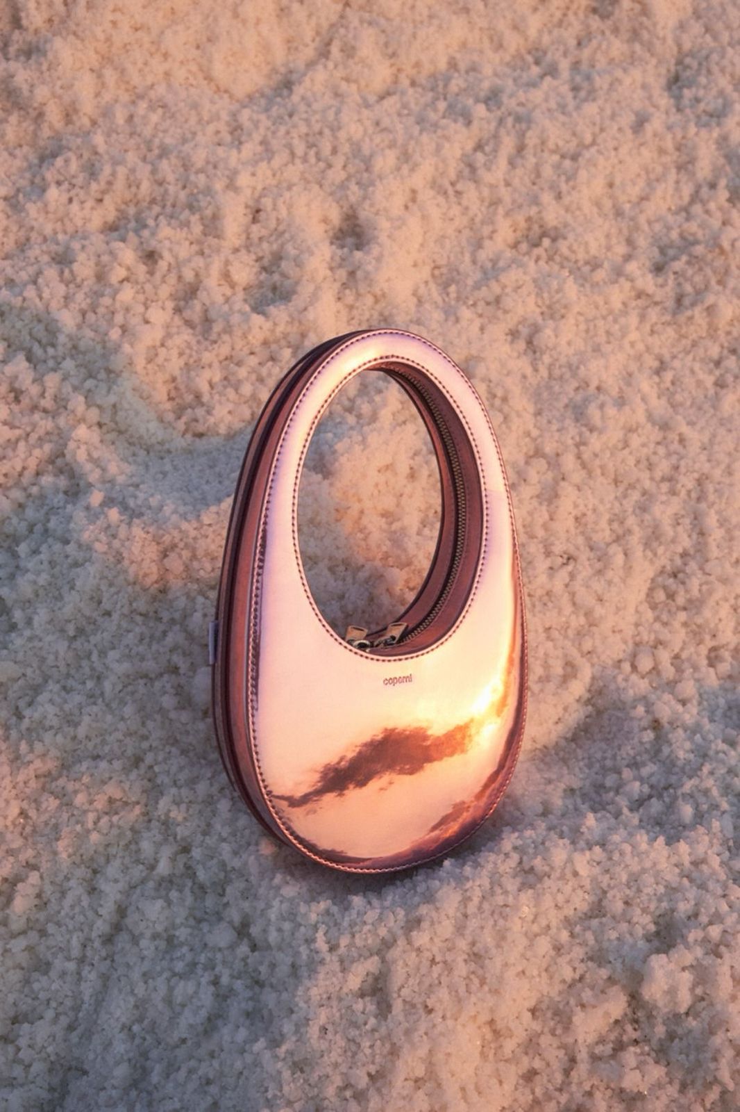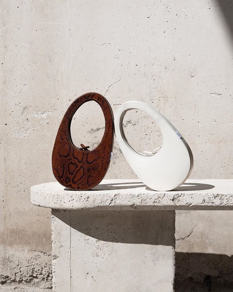 Uno de sus íconos es la Swipe Bag, un bolso con forma de óvalo alargado inspirado en el ícono de “deslizar para desbloquear” del iPhone. Esta silueta simple, sin ornamentos, se siente casi arquitectónica: líneas puras, curvas suaves, una forma reconocible que parece salida de un render 3D.