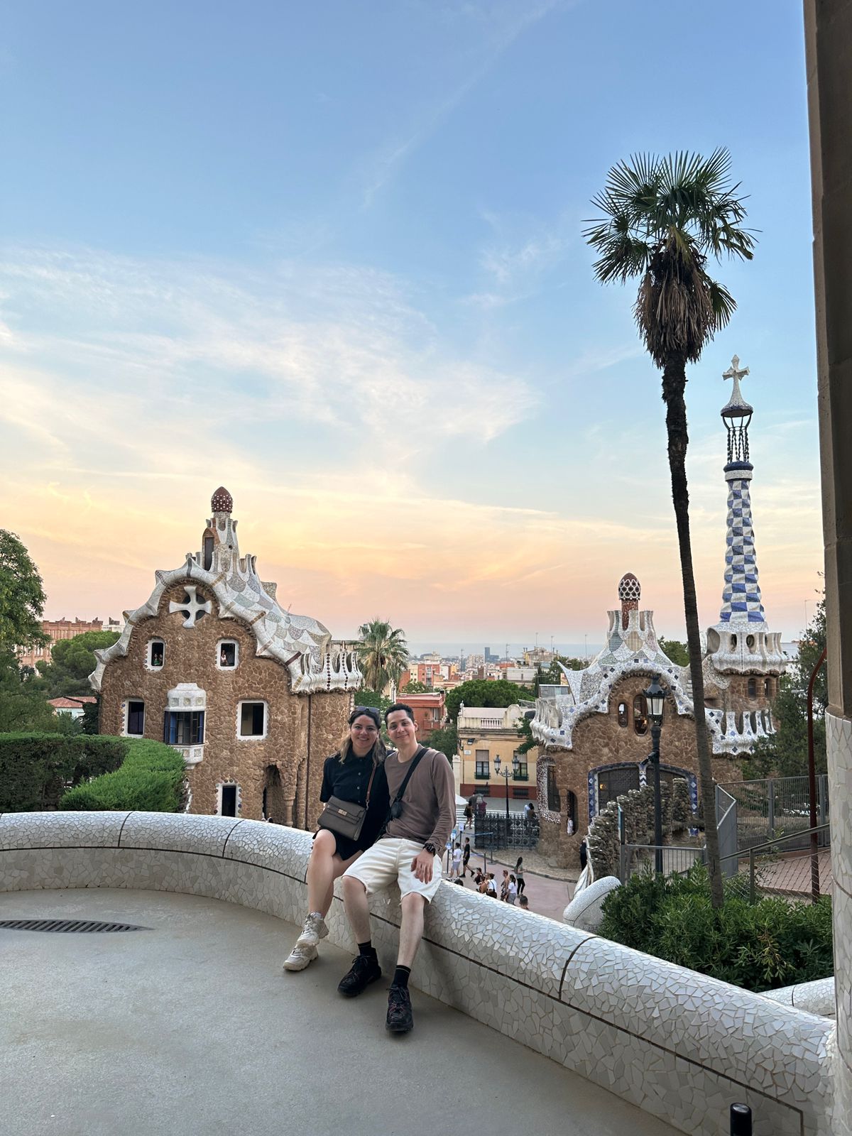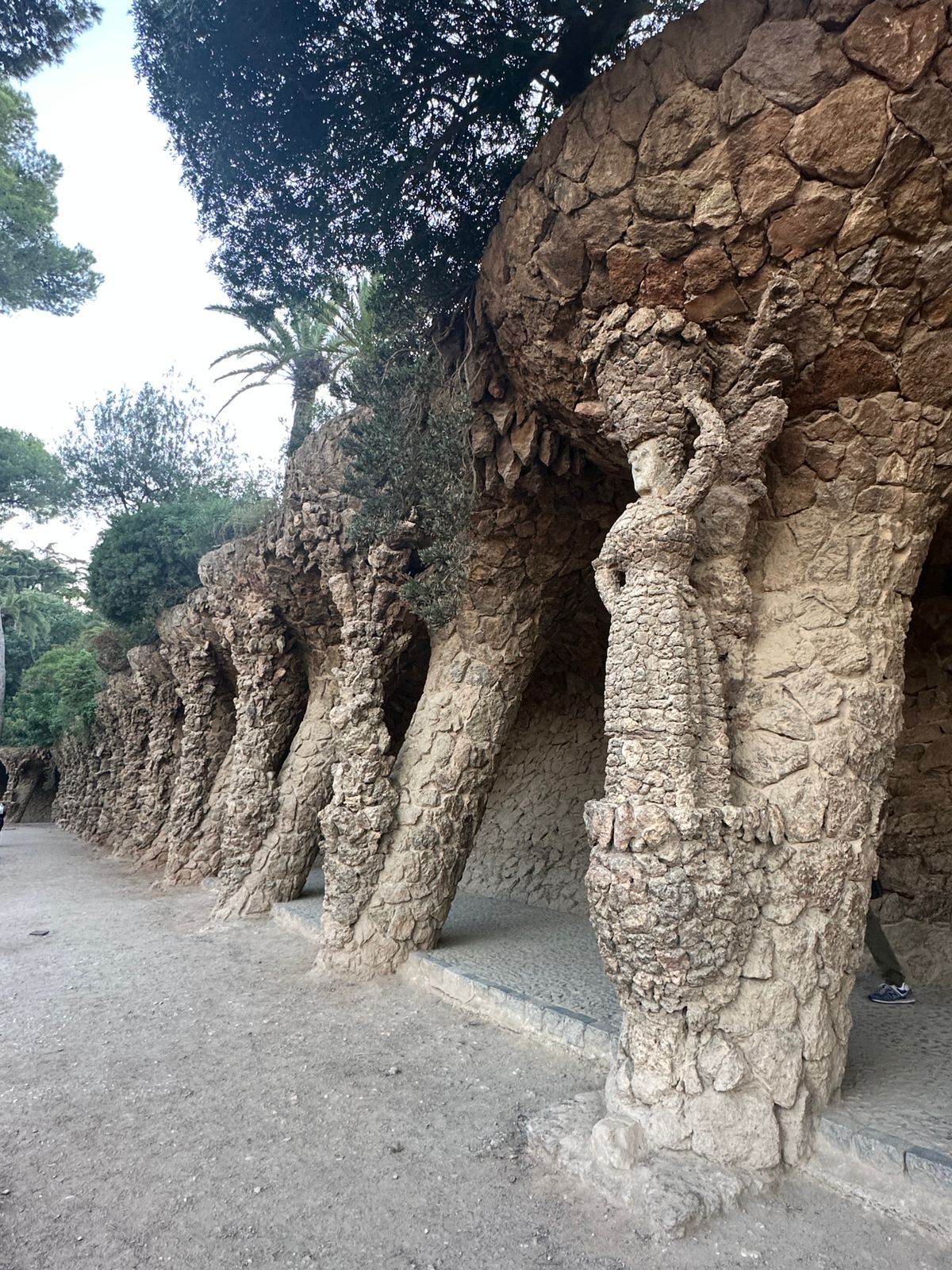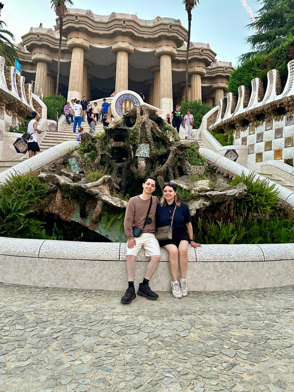 Bancas orgánicas, mosaicos, columnas inclinadas, integración total con el paisaje.