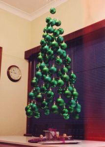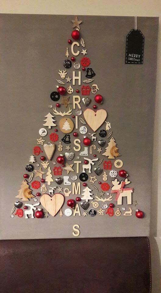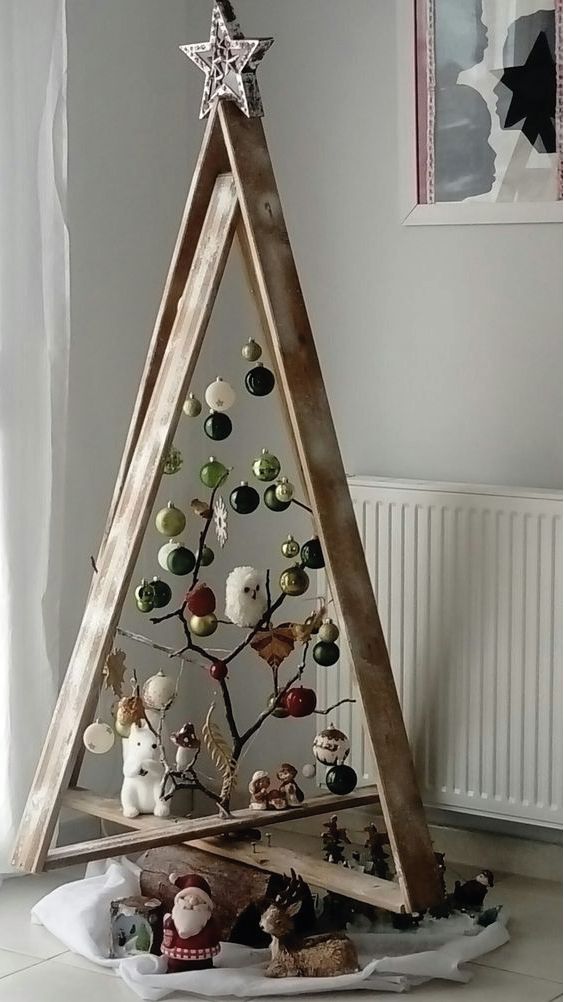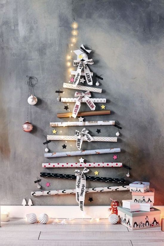 Esta idea es bastante buena para ahorrar espacio y crear un área mucho más limpia y sofisticada. Al igual que en la imagen puedes jugar con diferentes decoraciones para agregar textura y hacer tu árbol navideño aún más original.