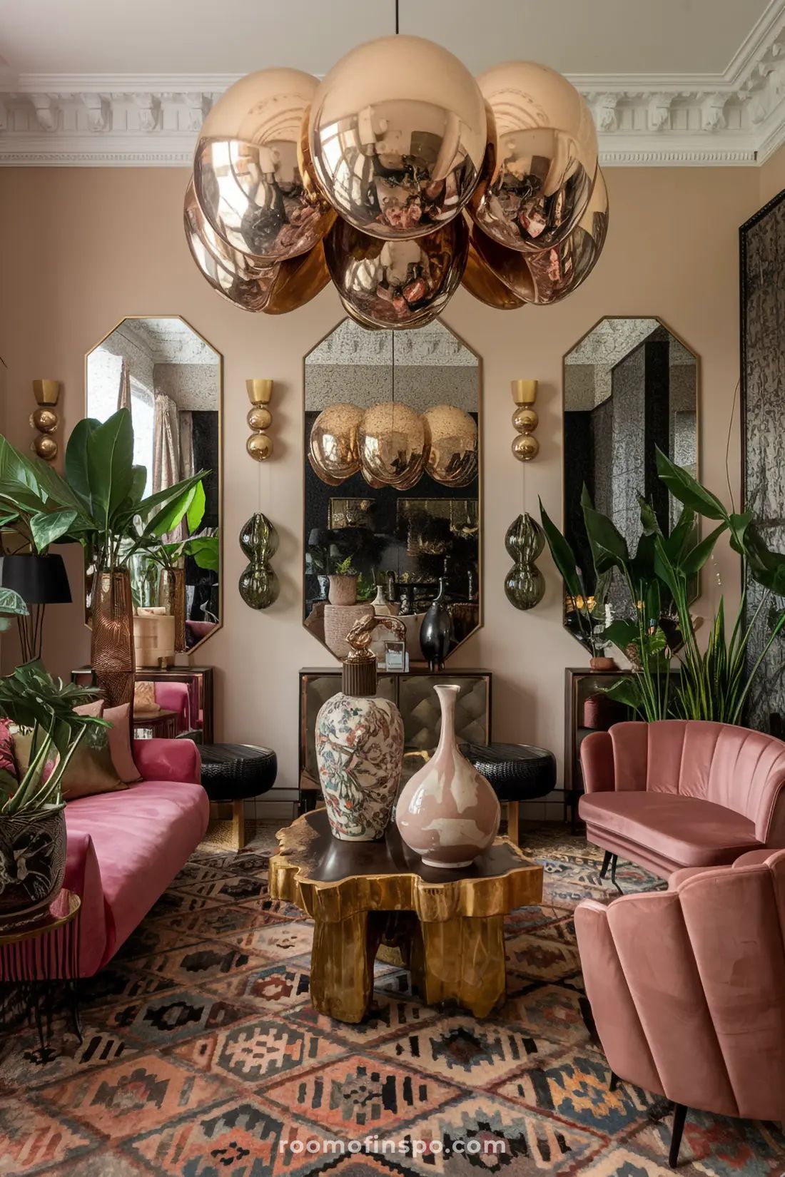 •Espejos grandes y lámparas de diseño como puntos focales.