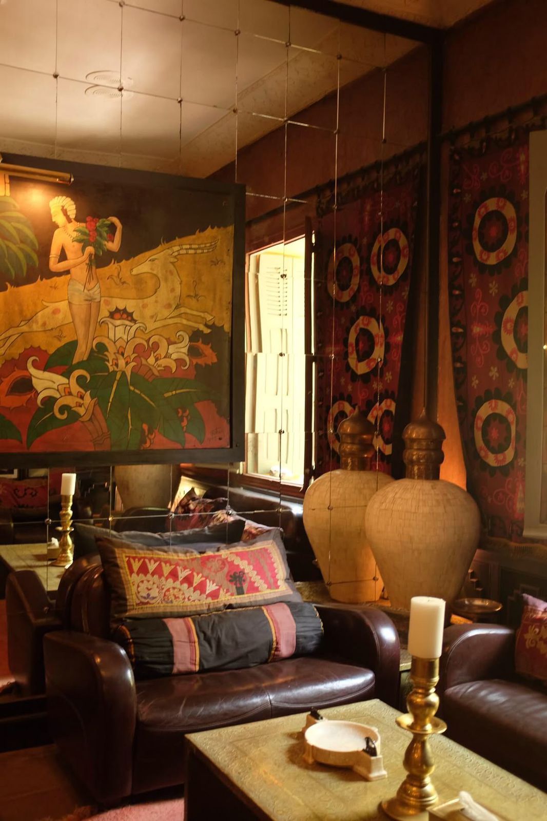 •Alfombras persas, madera oscura y lámparas escultóricas.