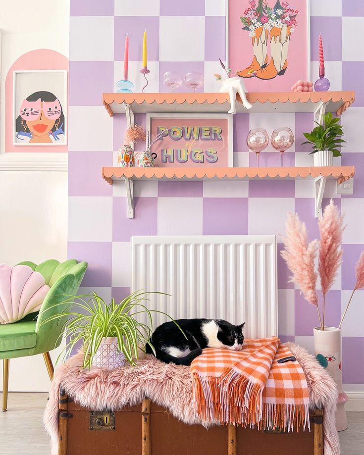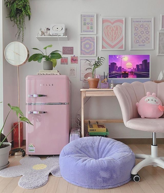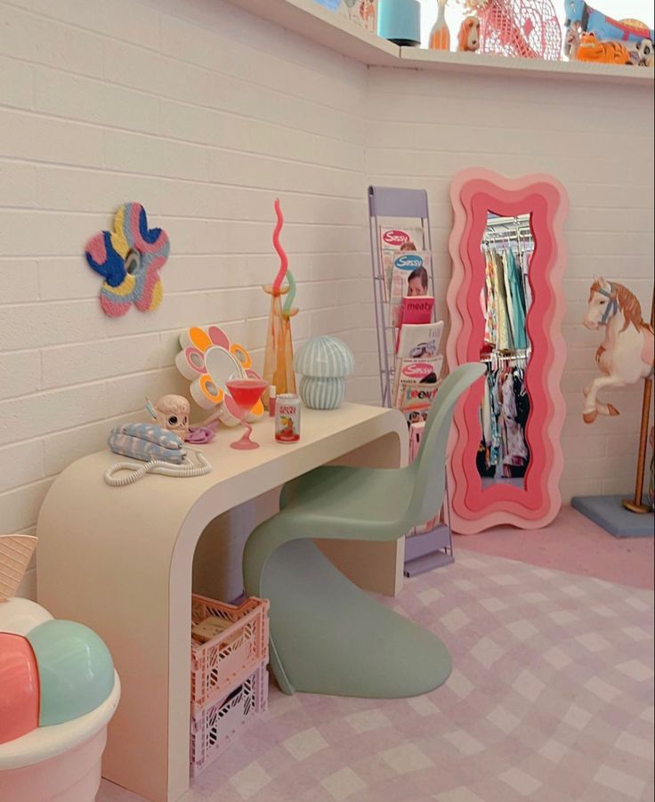 ⦁ Crea una pared “acento”, en este muro se colocarán elementos kitsch como cuadros, espejos con marco irregular, muchos colores y patrones, posters. Esta pared es para sacar toda tu personalidad, como las paredes cubiertas de posters de tus artistas favoritos de los años 2000.