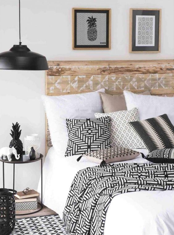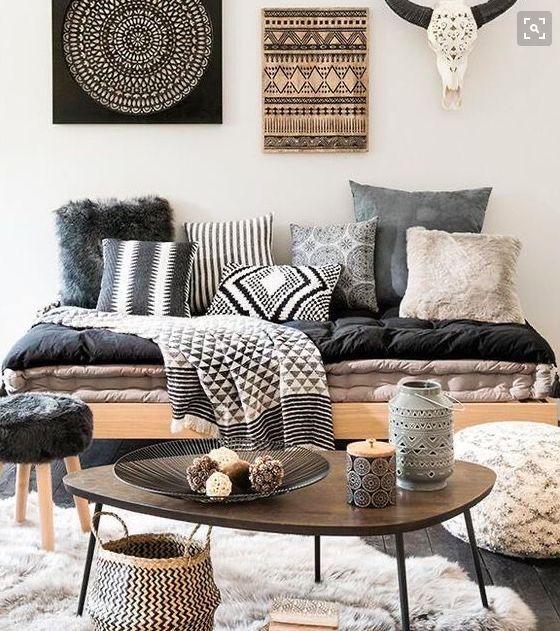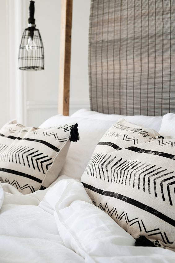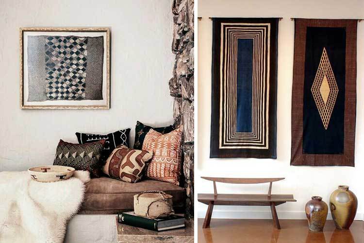 Diseños incas o aztecas, así como todo tipo de diseño con formas geométricas, fundamentalmente rombos y los triángulos en tonos muy contrastados (blancos sobre negros, marrones o azules oscuros fundamentalmente) abundan en  los interiores étnicos tanto en mobiliario como en alfombras, complementos textiles o ropa de cama.