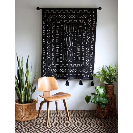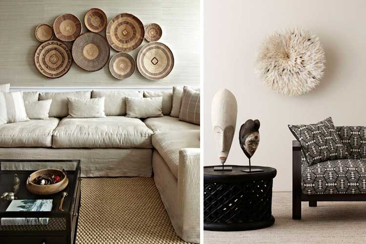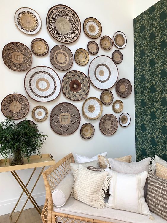 Uno de los elementos decorativos para la decoración de paredes en estilo étnico es el plato artesanal. Pueden ser pintados (normalmente en no más de dos tonos y con motivos geométricos) o bien de mimbre.