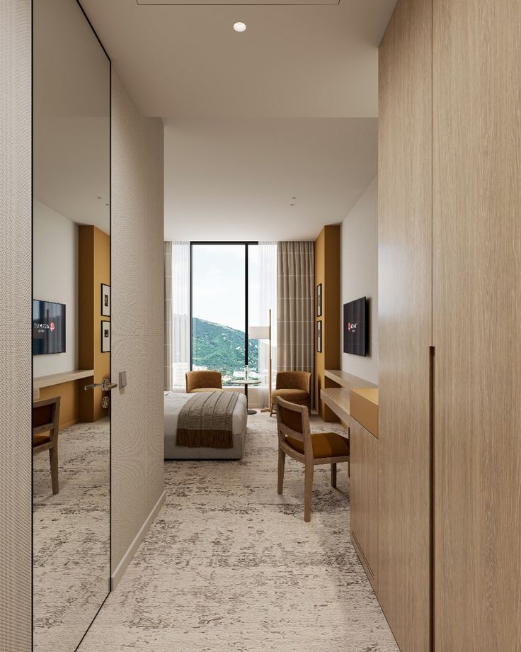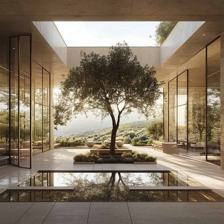 El diseño busca reconectar con el entorno: patios interiores, jardines verticales y ventanales de piso a techo que difuminan los límites entre interior y exterior.