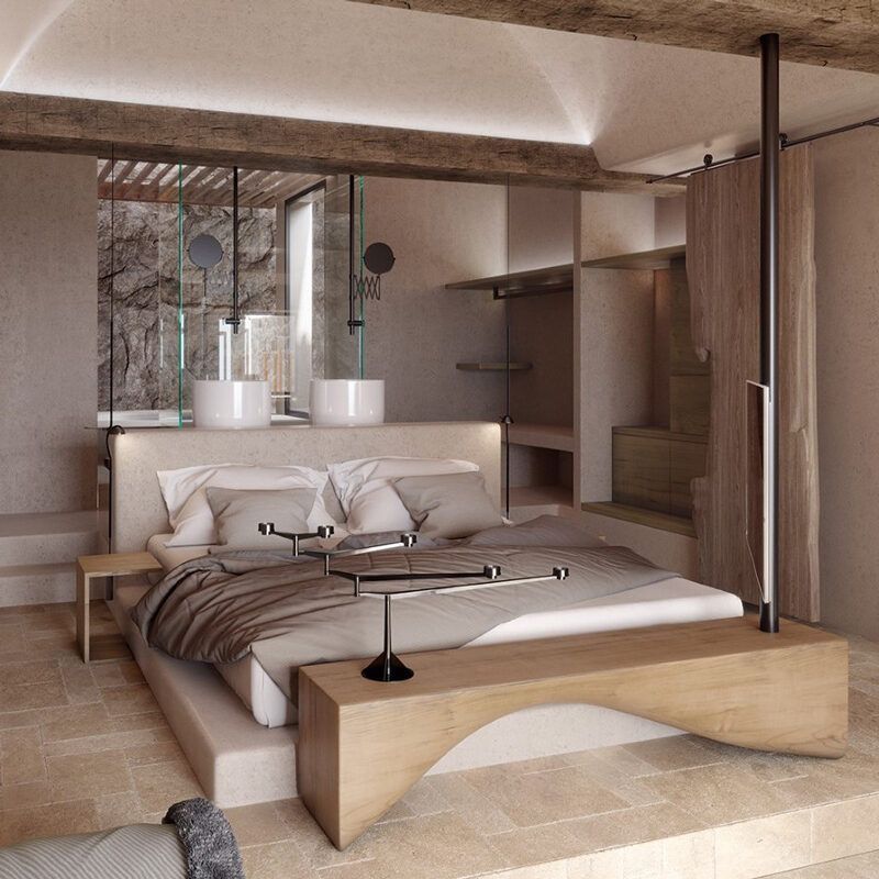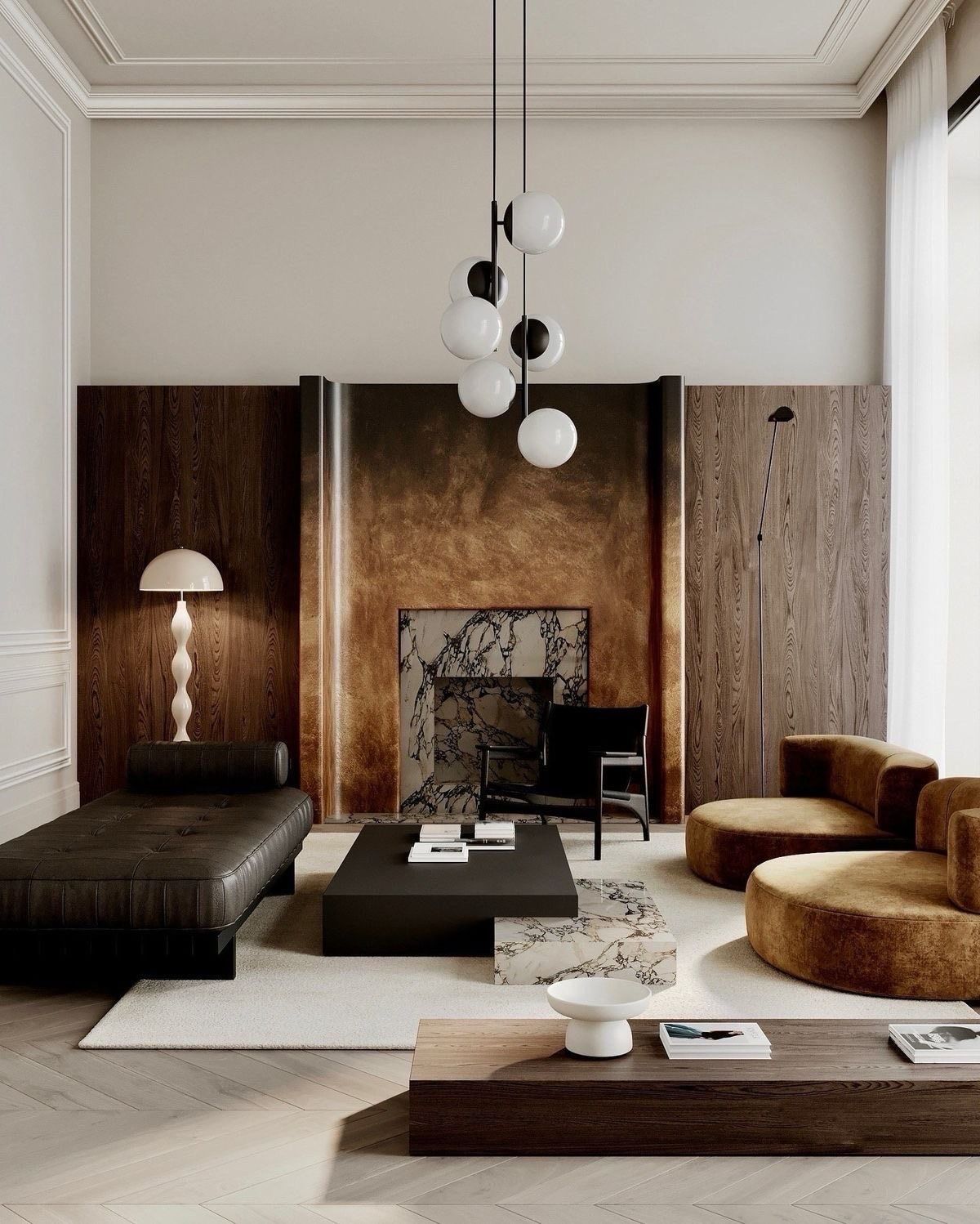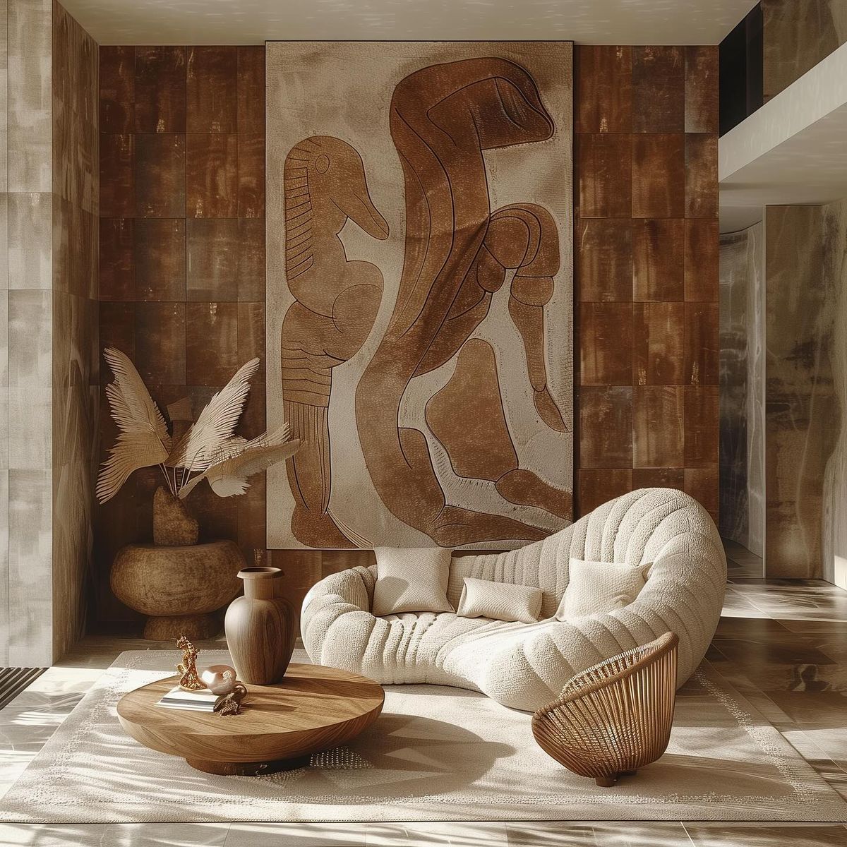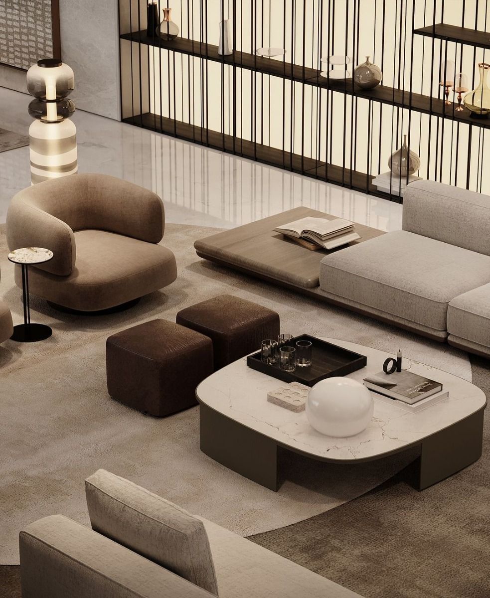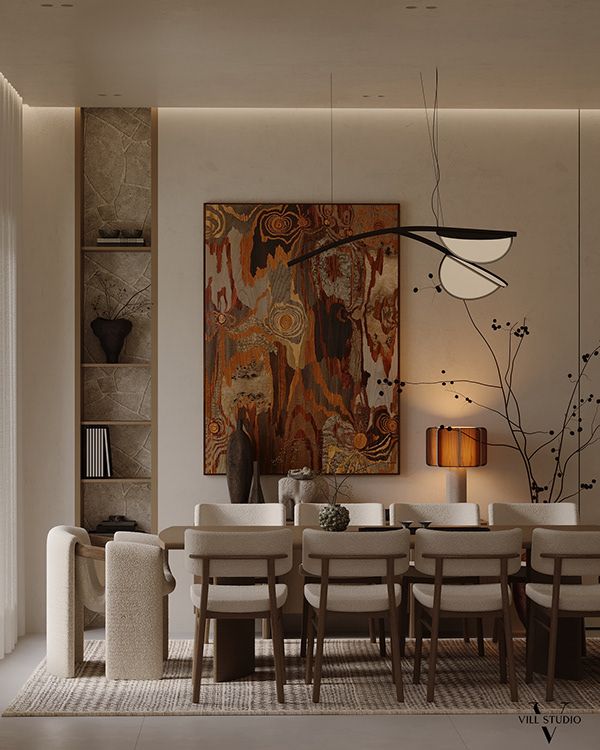 El color sigue siendo sobrio —arenas, grises, hueso— pero se enriquece con acentos en piedra oscura, madera ahumada o arte contemporáneo de gran formato.