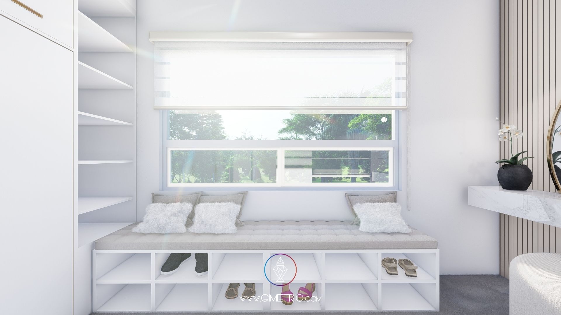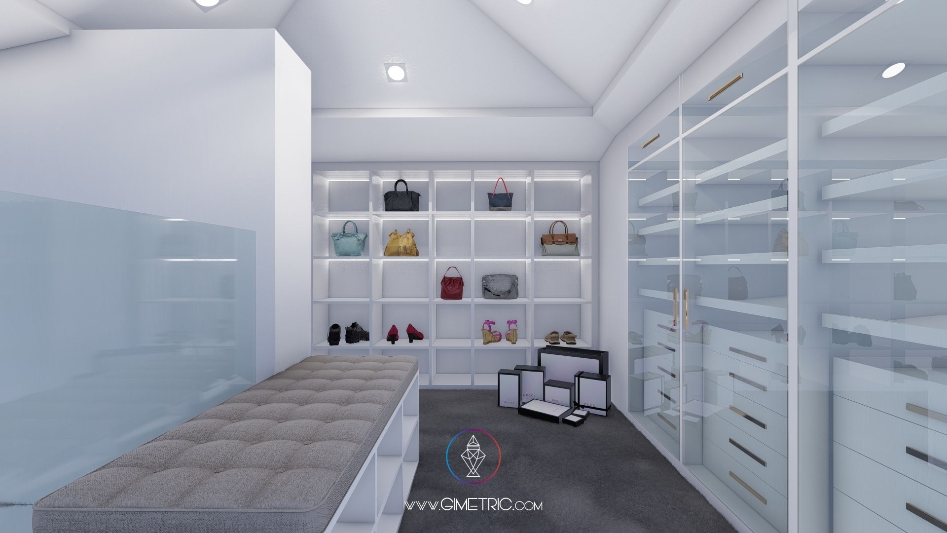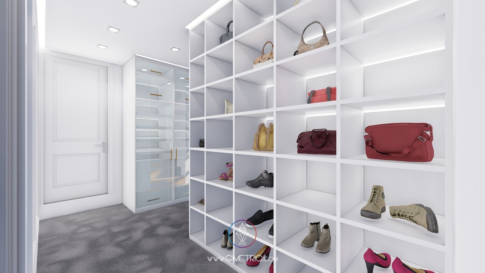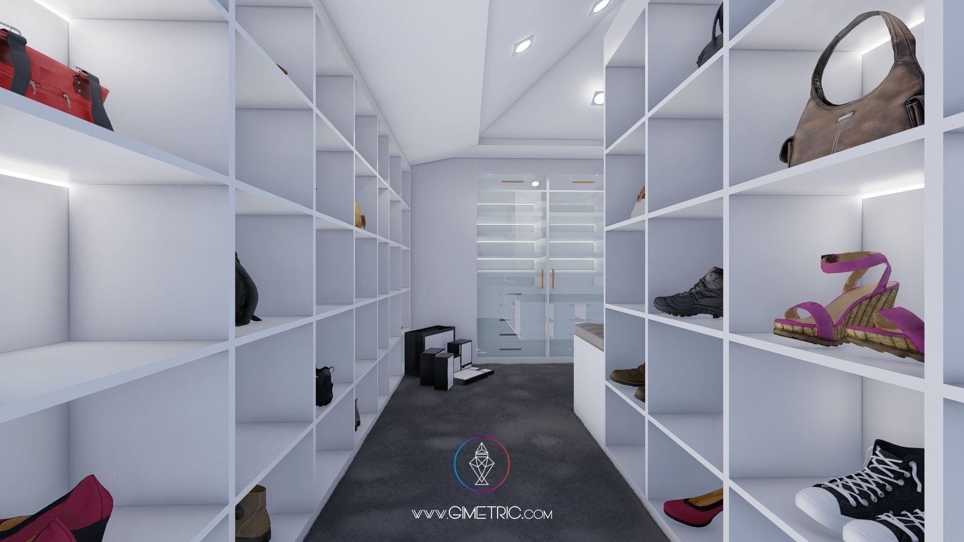 Este impresionante vestidor cuenta con dos áreas de exhibición para bolsas y zapatos tanto en planta baja como en planta alta, además de un área de tocador, y muchísimo espacio de almacenamiento que sin duda es el sueño de cualquier mujer.