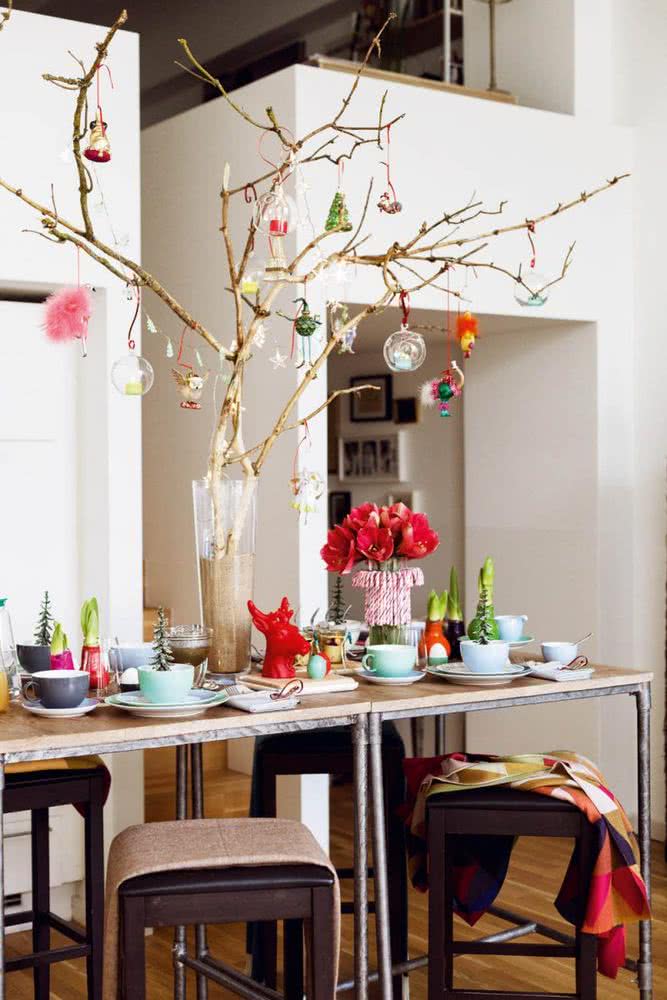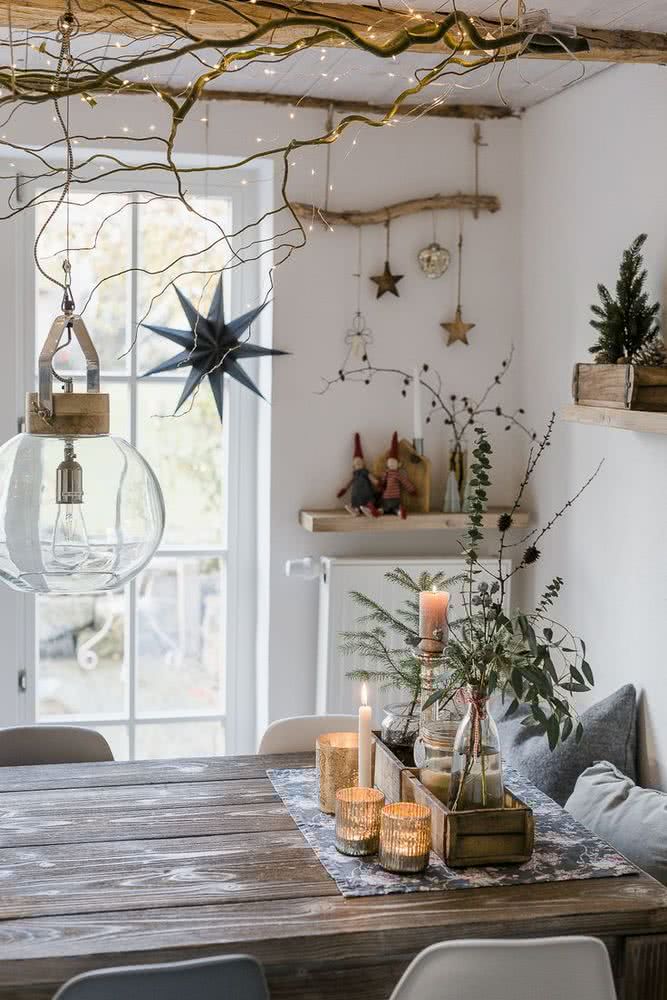 En este tipo de decoración el atractivo es todo aquello que puedas añadir a la decoración con toques de la naturaleza y mezclarlo con adornos modernos, las ramas por ejemplo, las guirnaldas, hechas de elementos naturales son perfectas para decorar chimeneas, mesas, estantes, puertas y ventanas, también coloca ramas, semillas, piñones, fibras naturales, adornos de lana, adornos hechos de madera, elementos textiles o de papel, que proporcionan una sensación muy acogedora, además agrega velas, una hermosa decoración con elementos naturales y objetos modernos conlleva a la simplicidad natural y espíritu de invierno.