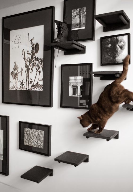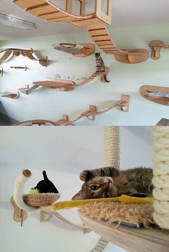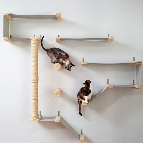Adaptar espacios interactivos y juguetes para tu mascota no significa que tengas que sacrificar espacio en tu hogar, una buena idea para ahorrar espacio es colocar en las paredes e incluso techos repisas, puentes y rascadores para que tu gatito se divierta y se sienta más cómodo en casa.