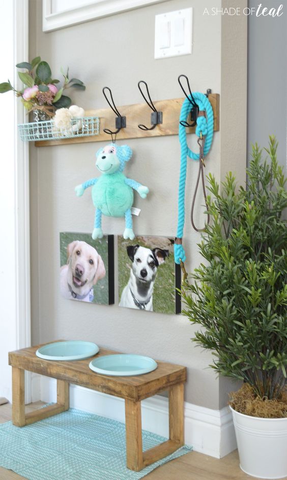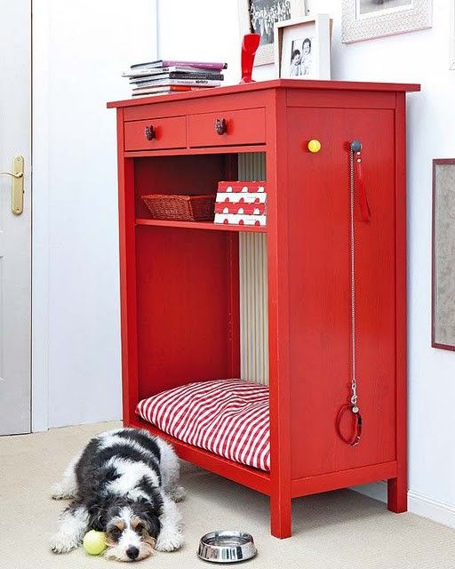 Pinta el mueble que tienes destinado a tu mascota de tu color favorito, puedes detallarlo con el nombre de tu amigo, tus fotos favoritas, etc. Trata de aprovechar todos los espacios; puedes colocar su correa, premios, juguetes, un contenedor de comida o sus bolsitas para el paseo e incluso su cama.