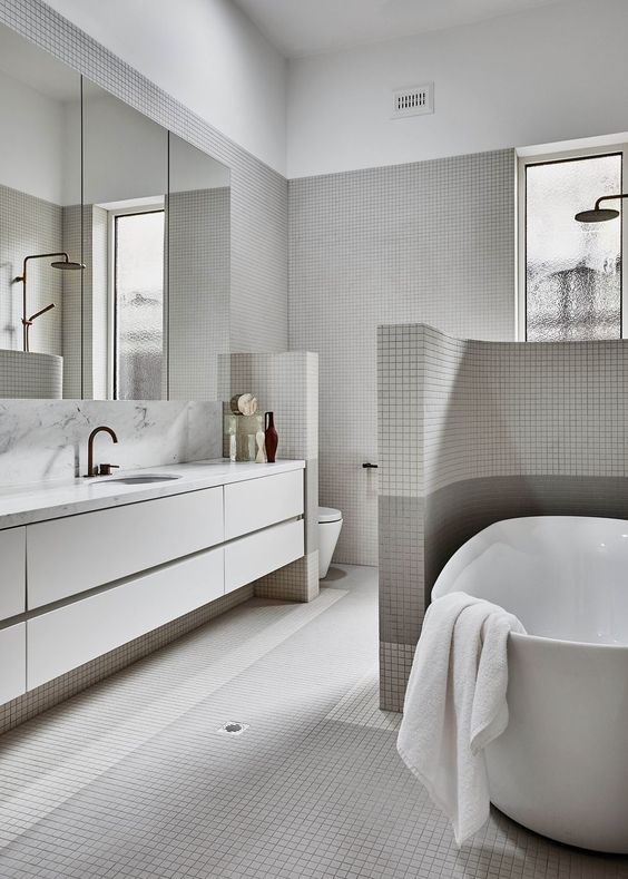 Para un cuarto de baño, que es un poco más húmedo, un lugar de relajación podemos utilizar colores claros y neutros como blanco, beige y gris, para transmitir limpieza, pero al mismo tiempo podemos resaltar algunos detalles con tintes en tonos verde o azul, que transmiten calma y frescura.