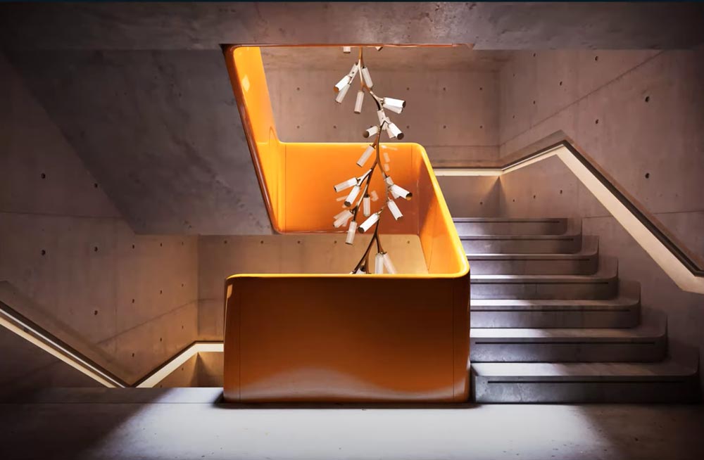 👉 Ejemplo: un vestíbulo que conduce la mirada hacia una escalera monumental.