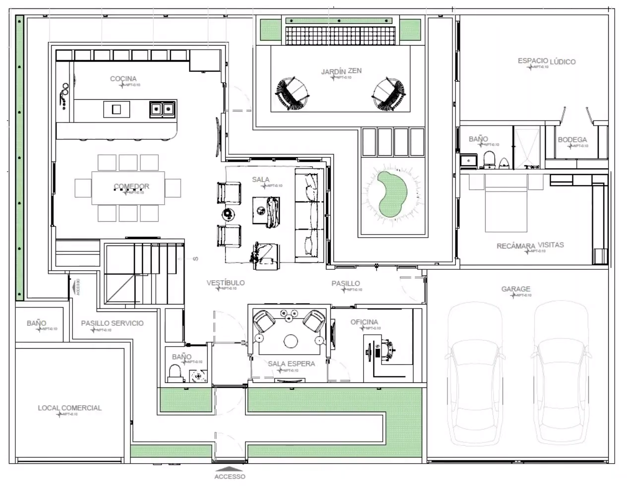 El elemento principal de este nivel, y probablemente de toda la casa, es el jardín Zen interior; Con vista desde todas las habitaciones para el cuidado de los más pequeños de la casa, este jardín se ubica al centro del proyecto, lo que genera que ingrese luz a todos los espacios de la vivienda. Con el estilo zen se busca disminuir el costo de construcción y mantenimiento, ya que el uso de pasto es muy limitado.