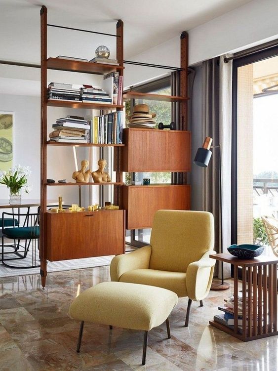 Estanterías Abiertas: Las estanterías abiertas o libreros son una excelente manera de dividir el espacio mientras se añade almacenamiento funcional. Puedes usarlas para exhibir libros, plantas y objetos decorativos.Consejo: Coloca elementos decorativos de diferentes alturas para dar un toque dinámico y mantener la sensación de apertura.