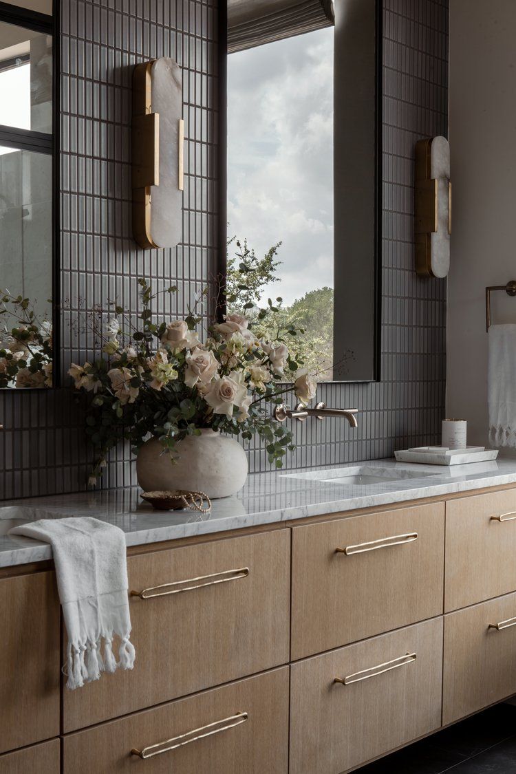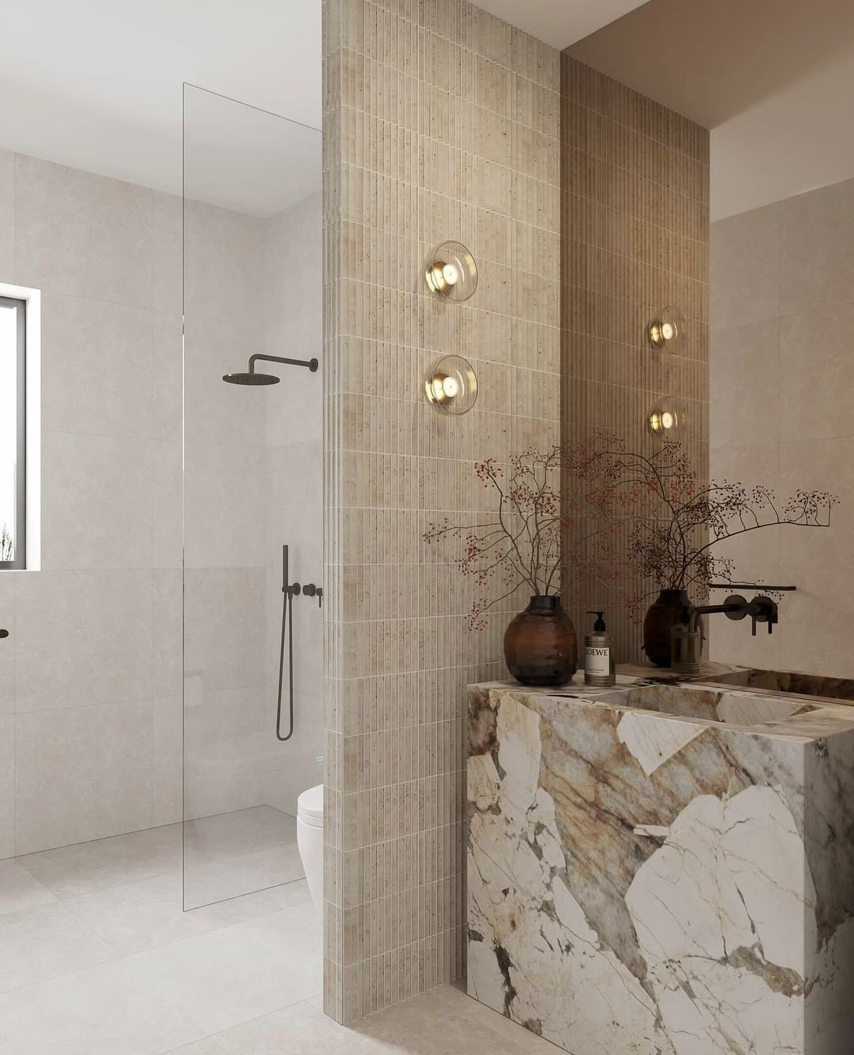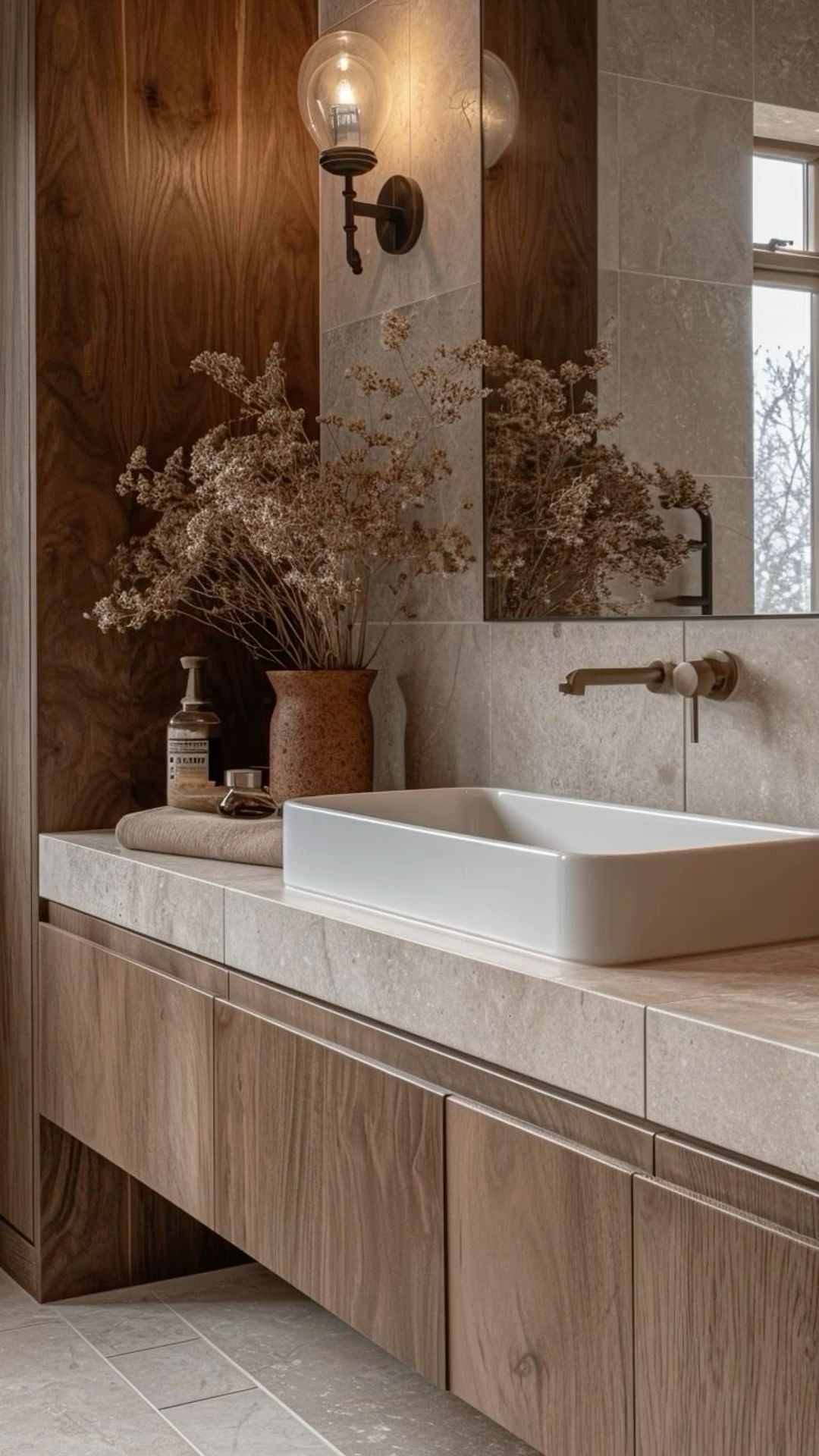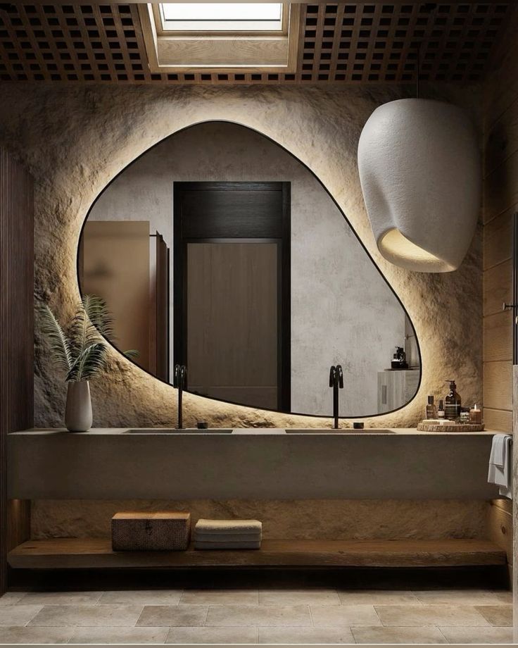 🛁 4. Baños sensoriales: piedra cálida, madera tratada y luz rasante
