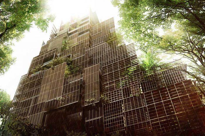 – Torre del hotel Rosewood en São Paulo (Brasil). El edificio de uso mixto intenta reproducir una mini-selva brasileña habitable donde se incorporan las energías renovables y que contará con 10000 árboles. Como ves, el elemento estrella en estos proyectos punteros es la masa vegetal. También contrasta la ausencia de muros cortina propios de los rascacielos y edificios de lujo y una apuesta en cambio por la madera en fachada.