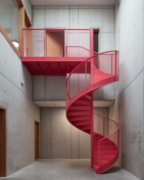 Hecha doblando una lámina de acero. Una escalera bastante especial, cada escalón se sujeta de la estructura de concreto con bastante precisión. Para ello y soportar el peso se ha utilizado una lámina de alto calibre que no sedera ante el peso.