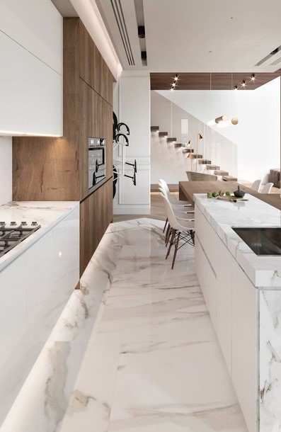 Para este ambiente que es un lugar con más transito constante, se recomienda que sea un piso resistente, puede ser de cerámica, mármol o granito. Son pisos fríos, pero son muy resistentes y vienen con diseños muy elegantes, además en placas grandes, ideales para espacios amplios.