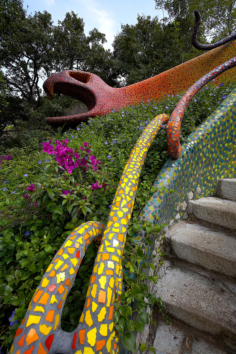 La estructura principal del cuerpo de la serpiente está hecha de ferrocemento de colores iridiscentes, la paleta de colores toma los verdes, azules, dorados y violetas para simular las plumas de la mítica serpiente emplumada. En cuestión de tamaños, el volumen interno de la serpiente es 6.50 m de alto por 8.60m, cada departamento es de 200 m2 con bóvedas internas, muros terrosos y semicurvos, y ventanas con vistas a los jardines.