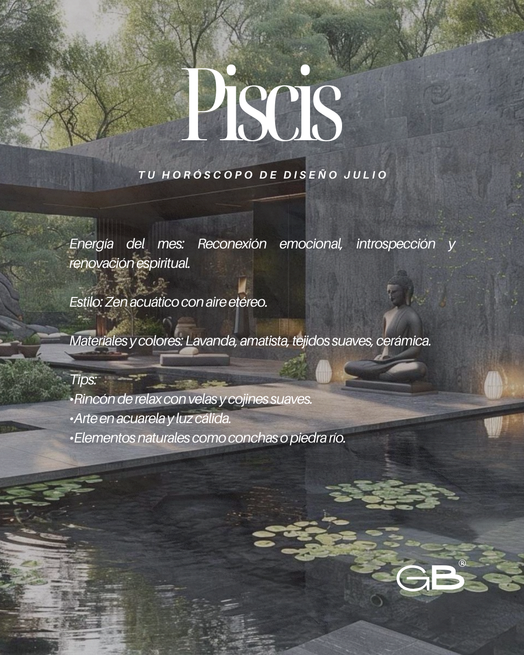 Estilo: Zen acuático con aire etéreo.