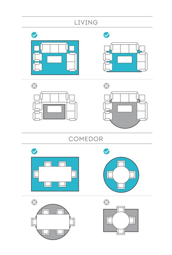 Si quieres decorar con alfombras en zonas de muebles, todas las patas de éstos deben quedar dentro de ella, incluso en el caso de separar las sillas de la mesa, éstas deberían pisar el textil. De esta forma nunca quedará como un elemento pobre y el espacio quedará perfectamente delimitado.