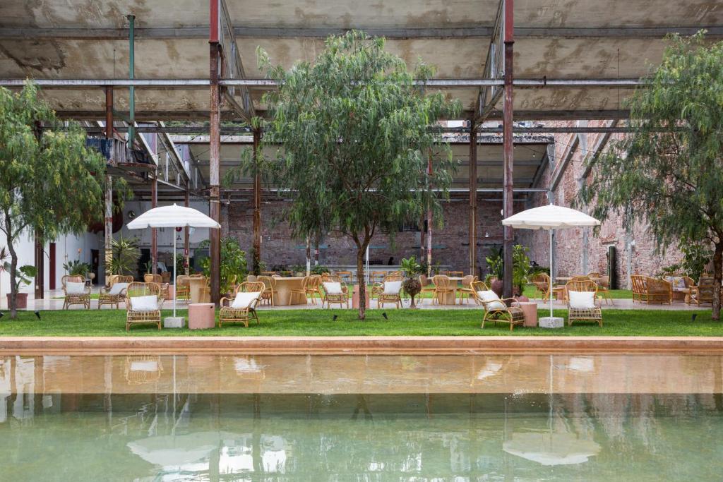 El Hotel Hércules ofrece 40 habitaciones decoradas con piezas mid-century, algunas con terrazas y vistas al jardín de olivos. La cervecería, ubicada en el ala oriente de la antigua fábrica, ofrece una variedad de cervezas artesanales en un ambiente único, respaldado por buena música y eventos culturales.